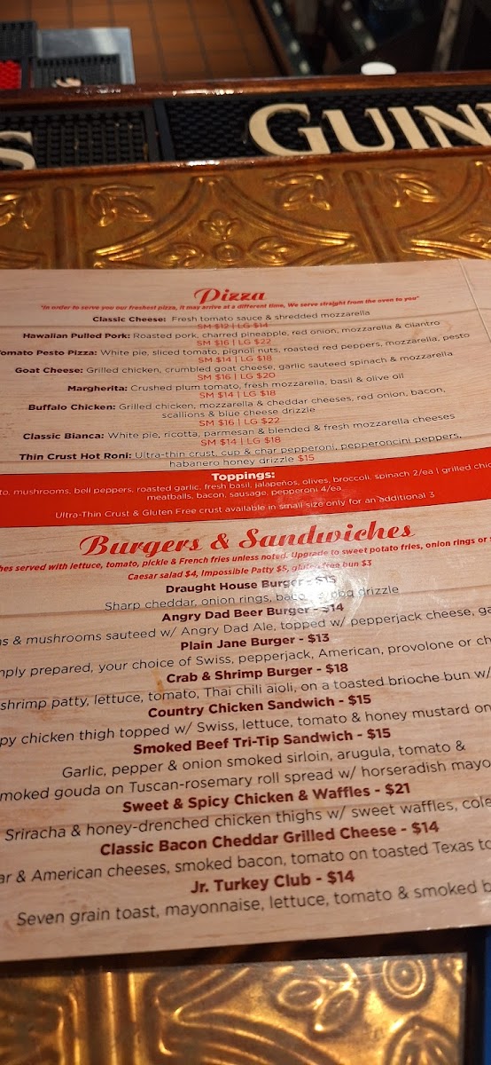 Finish off your meal with a slice of Carrot Cake or a comforting Chocolate Chip Pecan Pie. With a commitment to excellent service and a family-friendly atmosphere, Angry Dad Draught House is not just a place to eat—it's a destination for great memories.